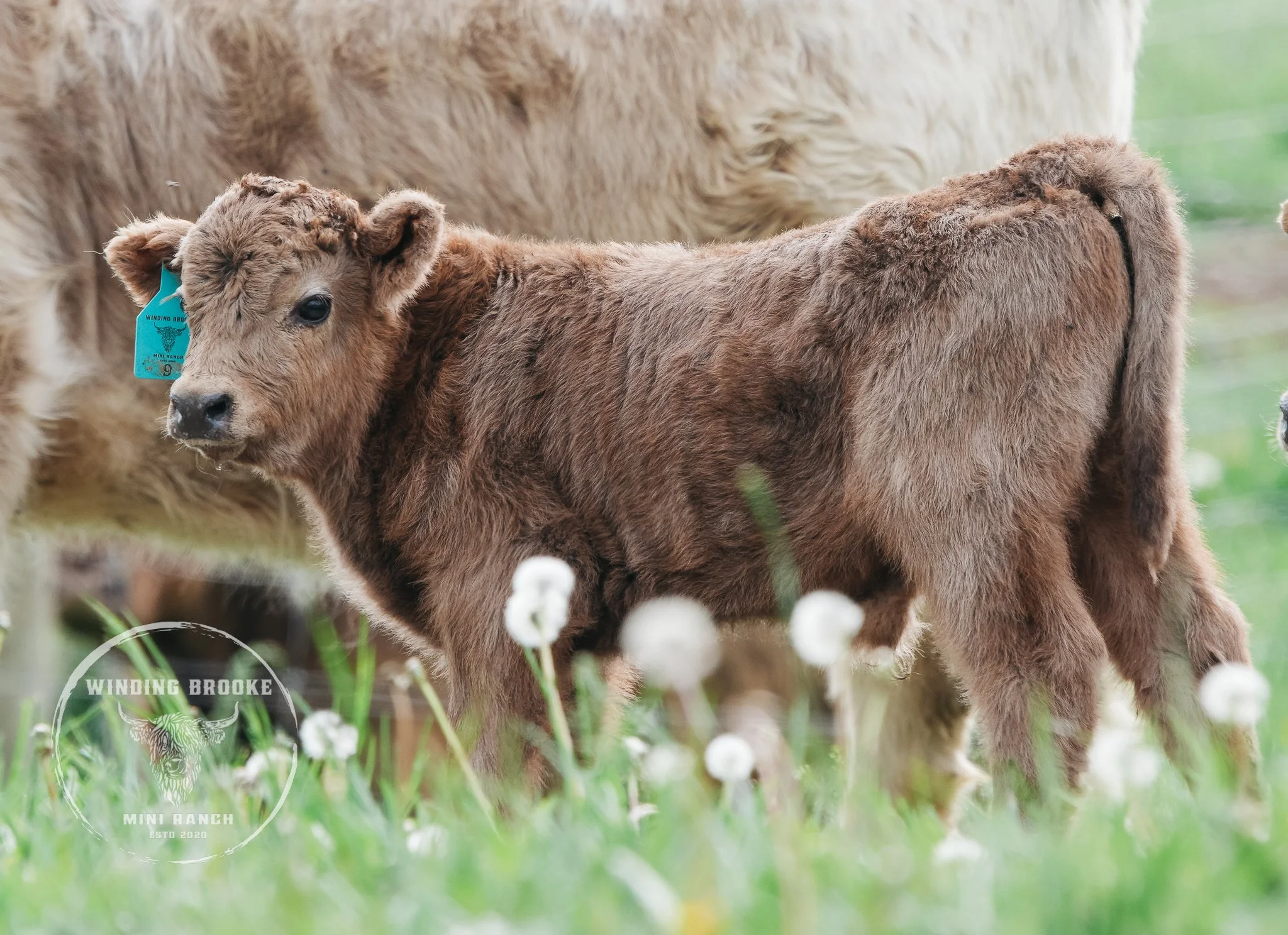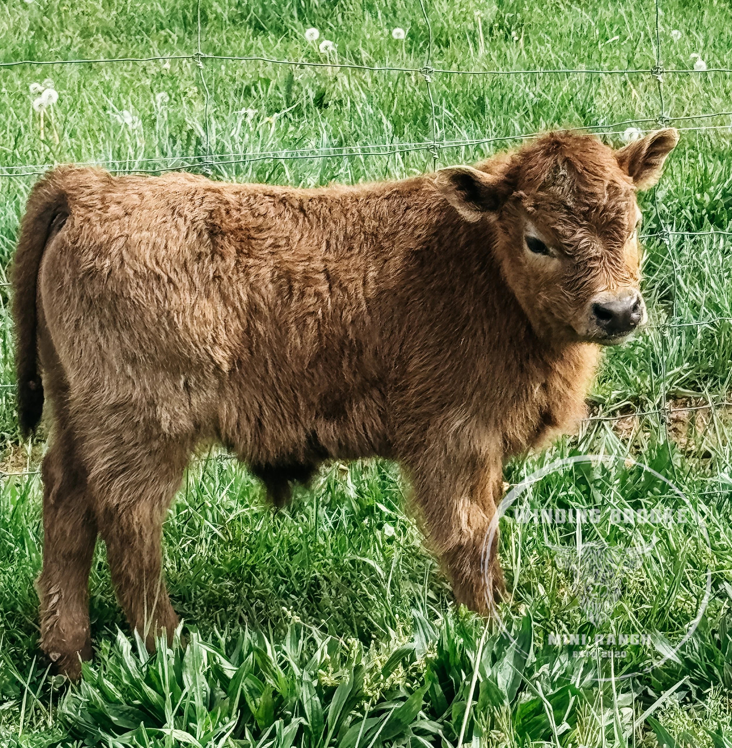 Welcome to the world Blue! Blue is a tiny steer calf and chondro positive! He is a deep rich dun color and is 62.5% highland. Blue will stay very small :) This was a repeat breeding from 2024- Fancy x Norman. Blue will be ready for his new home in the August timeframe.