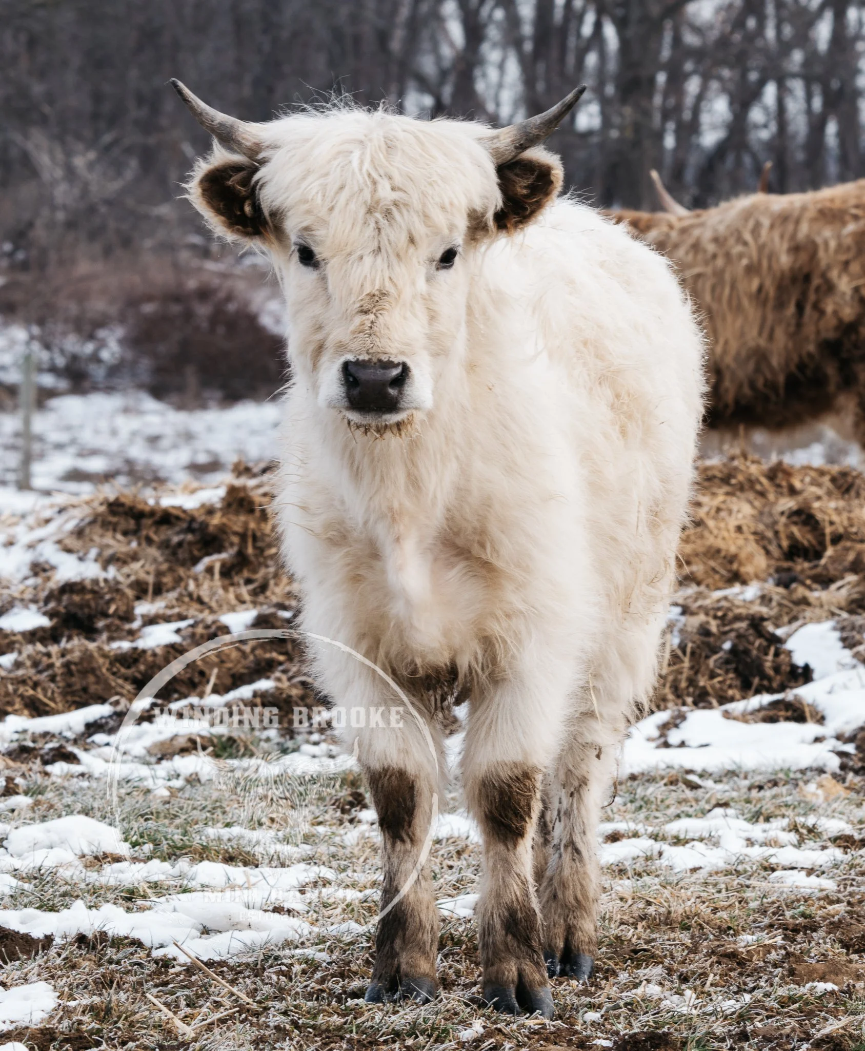 Doreen is a 6 year old white highland cow with the most unique horns. Doreen is 44” from the top line and has the most gorgeous hair. Doreen has given us 2 beautiful heifer calves and will be bred back to Bougie for an early 2025 calf.